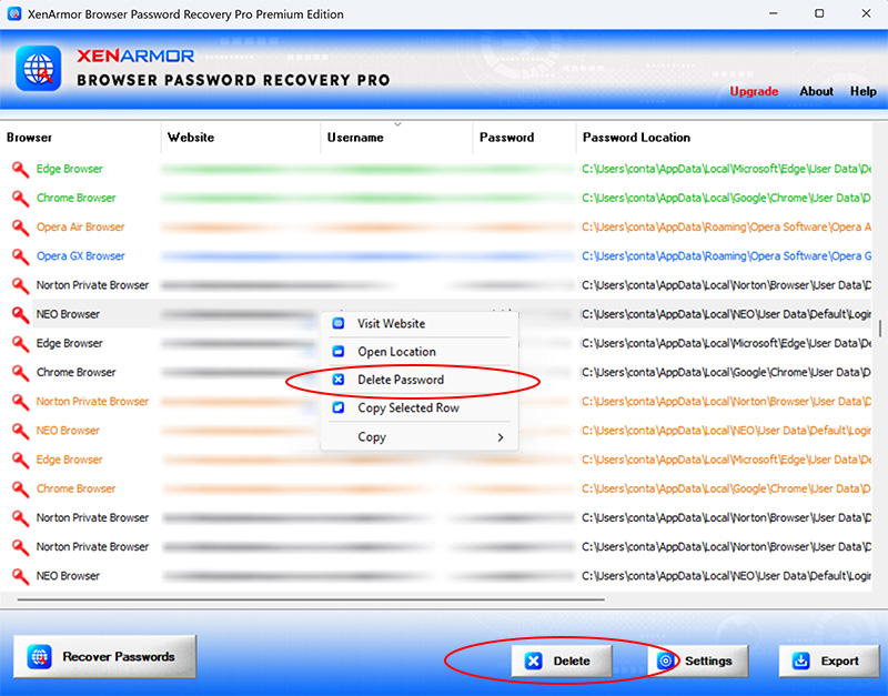 This is one of the unique & useful feature of XenArmor Browser Password Recovery Pro. It helps you to easily remove stored Password as well as Autofill secrets from selected Browsers as shown below,