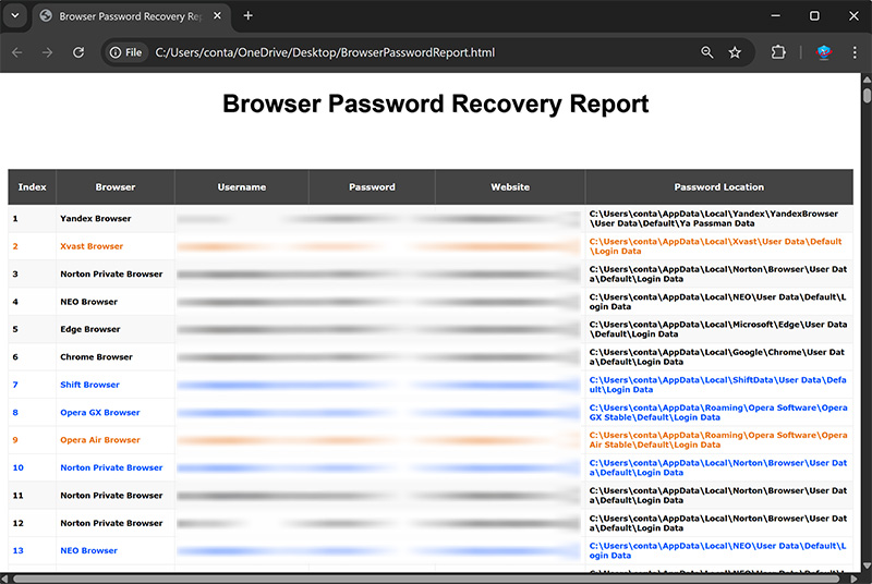 Mega digital signature release with support for password recovery from new Maxthon, Falkon, Orbitum, Waterfox & QQ Browser. Also generate password report in XML & JSON format.