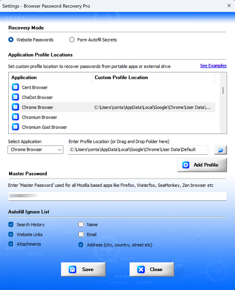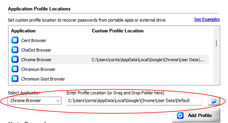 Advanced Browser Settings help you to tweak & customize Browser Password Recovery operations as per you need. Mainly it helps you to specify custom profile paths for each browser (see next section) and also specify the Master Password for Firefox.