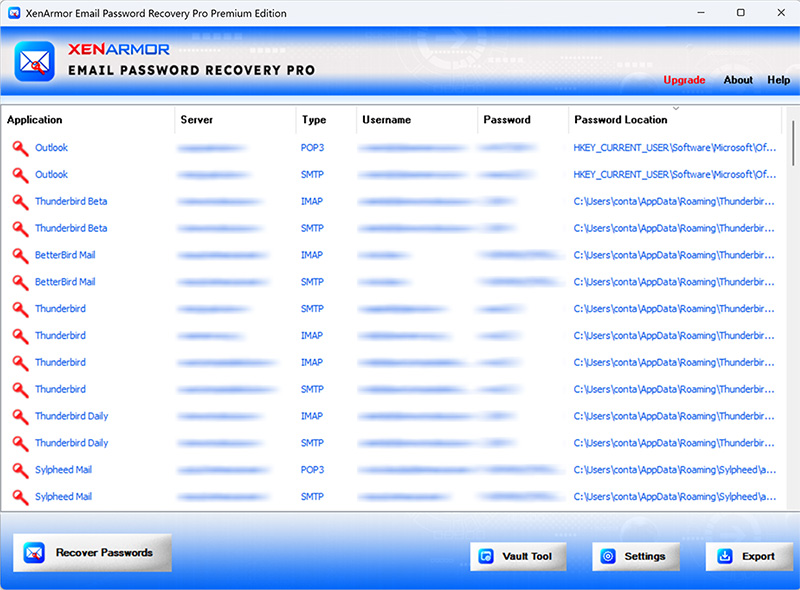 XenArmor Email Password Recovery Pro is very easy to use. After installation, just launch it. It will instantly recover and show all your stored mail passwords from popular email clients, messengers & top browsers as shown in the screenshot & video below,