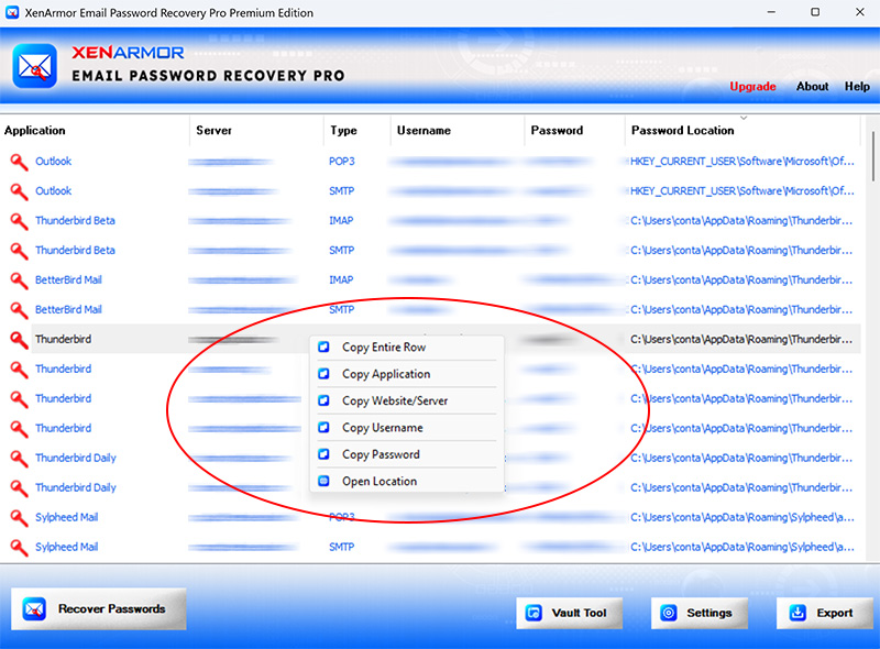 Right click context menu helps you to quickly & easily copy various fields (such as Application, Mail Server, Username, Password etc). Also you can launch the Mail Server website as shown below,