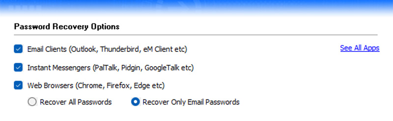 First section in Settings screen helps you to select or deselect applications to recover mail passwords from. You can select to recover passwords from Email clients, Browsers or Messengers etc.
