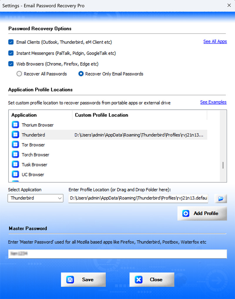 Settings Panel help you to tweak & customize Email Password Recovery operations as per you need. Mainly it helps you to select applications, specify custom profile paths & set master password options.