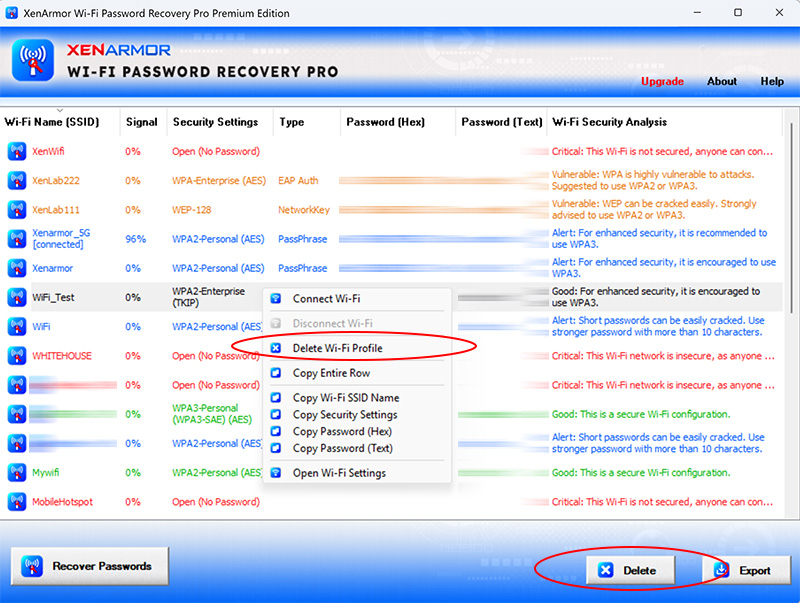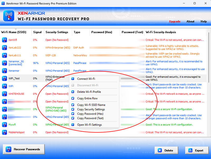 Premium Edition of WiFi Password Recovery Pro also performs detailed security analysis of each recovered wireless profile and classifies them as Dangerous, Vulnerable, Warning, Good based on their password security configuration.